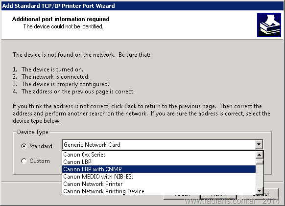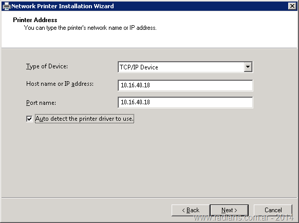 Luego debemos ingresar la IP que tiene asignada nuestra impresora, y tildamos la opción Auto detect the printer driver to use., luego hacemos clic en Next