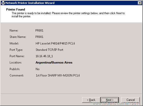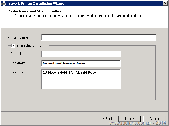 Ingresamos el nombre de la impresora y los demás datos, importante el tema de la Location, luego hacemos clic en Next