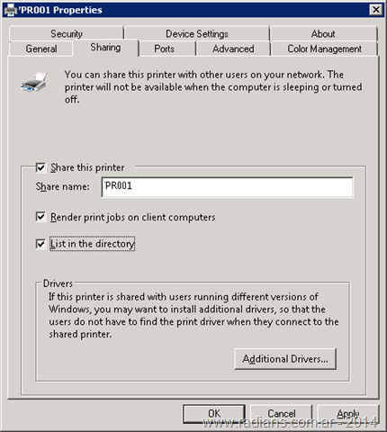 Listo, ya esta la impresora ahora lo que vamos a hacer es publicarla en nuestro Active Directory, y agregarle drivers para otros Sistemas Operativos. Para esto seleccionamos la impresora y haciendo un clic en ella seleccionamos las propiedades, luego vamos a la solapa Sharing y hacemos un clic en la opción List in the directory, luego hacemos clic en Next