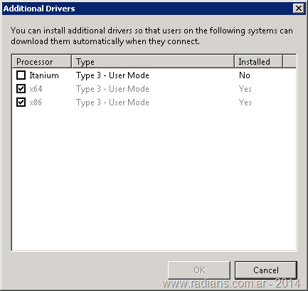 Si seleccionamos los drivers para nuestro print server y le sumamos los drivers de arquitectura x86, todos nuestros clientes podrán instalar los driver correctos cuando se conecten a la cola de impresión.