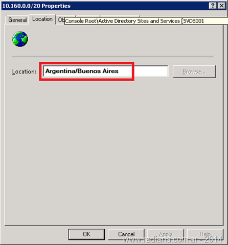 Algo que nos esta faltando es el tema de la ubicación o Location, para que en nuestras redes aparezcan primero las impresoras de nuestra oficina y no las de China primero, lo que debemos utilizar en la Subnet del Active Directory Sites and Services.