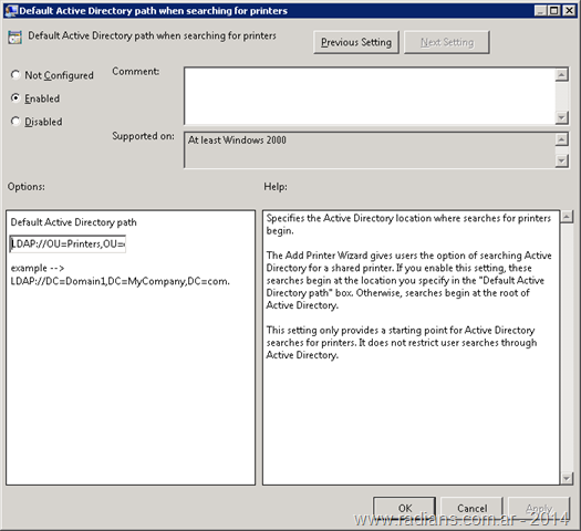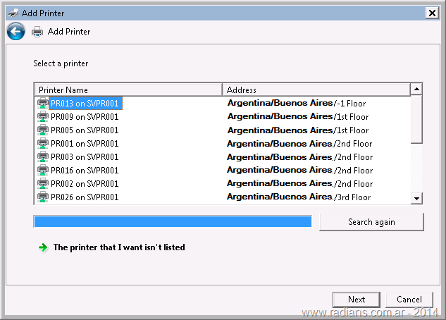 Si hacemos esto cuando desde nuestros clientes Windows 7 busquemos por las impresoras, veremos las que nos trae por defecto desde nuestro Active Directory por la consulta LDAP definida en la GPO(LDAP://OU=Printers,OU=BuenosAires,OU=Argentina,DC=radianslab,DC=com,DC=ar)