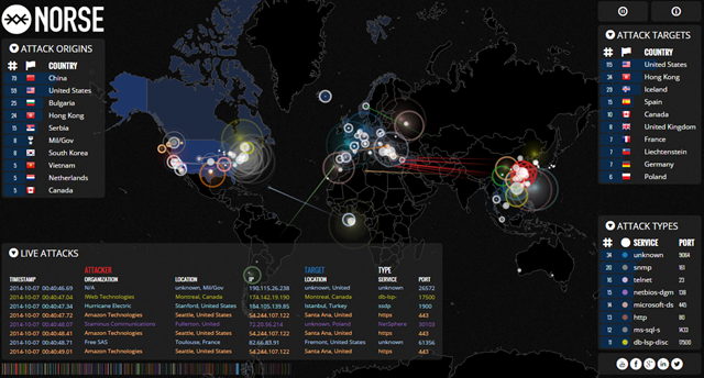 Cada segundo, Norse recoge y analiza la información sobre amenazas en vivo desde darknets en cientos de ubicaciones en más de 40 países. Los ataques que se muestran se basan en un pequeño subconjunto de los flujos en vivo contra la infraestructura Norse honeypot, que representan los ataques cibernéticos reales de todo el mundo. A primera vista, uno puede ver que los países son agresores u objetivos en el momento, utilizando el tipo de ataques (servicios-puertos).