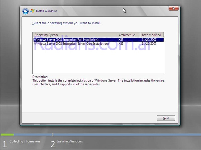 Seleccionamos el tipo de implementacion que queremos hacer, si es la version Core o la Full. Seleccionamos la version Full y hacemos un clic en Next.