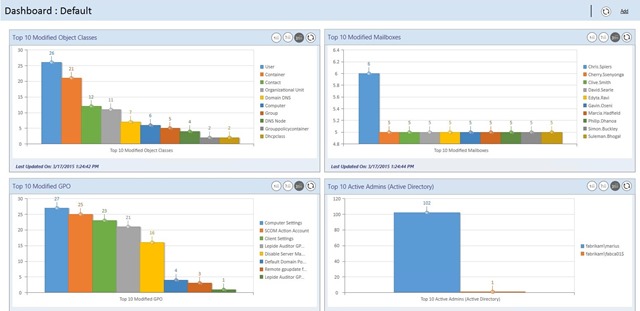 También tenemos unos potentes Dashboards en donde podemos ver fácilmente los cambios. Con cuadros de mando intuitivos que muestran los usuarios más activos haciendo cambios y tendencias de cambio en función de cada sistema, junto con la LiveFeed, que proporciona hasta el detalle cambio minuto, los Dashboards son esenciales para rápida y fácilmente identificar problemas en un nivel alto, sirviendo como la base para una investigación más profunda del caso.