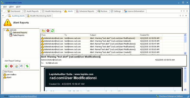“LepideAuditor Suite” nos da la posibilidad de generar alertas en tiempo real sobre ciertos cambios críticos tanto de Active Directory, de Políticas de Grupo, de cambios dentro de nuestro Exchange Server; y recibirlas por medio de un correo electrónico que nos ayudaran a proteger nuestros servidores contra el acceso no autorizado, las amenazas potenciales, cambios de políticas; alertas de usuarios, etc., etc. Nos brinda la posibilidad de emitir informes completos como para llevar a cabo la auditoría completa de nuestro ambiente. En los reportes podremos ver Qué, Cuándo y Dónde, nuestra información cambio; y tal como comentamos recibir alertas es sumamente crítico. Tener toda la información de forma centralizada mejorara los tiempos y el esfuerzo que debemos emplear para reunir la información necesaria y tomar las acciones preventivas necesarias.
