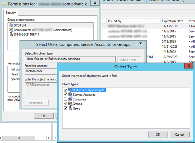 Hacemos clic en ‘Add …‘ para agregar la cuenta de usuario que ejecuta el servicio de AD FS en el servidor, la cual tiene los permisos de acceso de lectura.