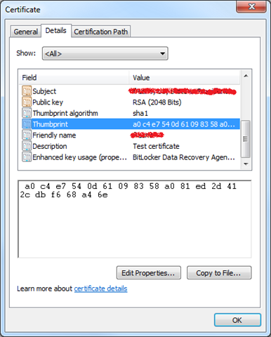 Debemos buscar el ThumbPrint del nuevo certicado, y podemos hacerlo buscando los detalles del mismo. Este ThumbPrint (huella digital) esta por lo general en la parte inferior de la lista de detalles para el certificado y se compone de 40 caracteres hexadecimales.
