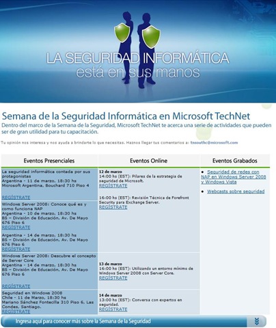Quería avisarles que del 8 al 13 de marzo será la semana de la seguridad de Tecnologías Microsoft. En esta semana habrá varias charlas de seguridad y distintos eventos presénciales y webcast en los que pueden participar.