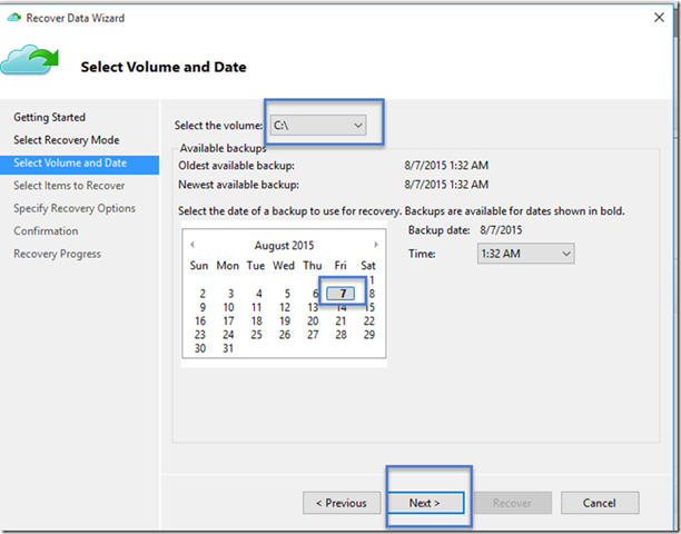 La pantalla le permite restaurar desde cualquier punto en el tiempo. Las fechas que aparecen en negrita en el control de calendario indican la disponibilidad de un punto de restauración. Una vez que hemos seleccionado una fecha, sobre la base de su horario de copia de seguridad, se puede seleccionar un punto en el tiempo desde el momento desplegable.