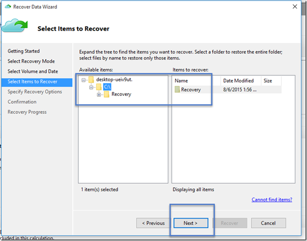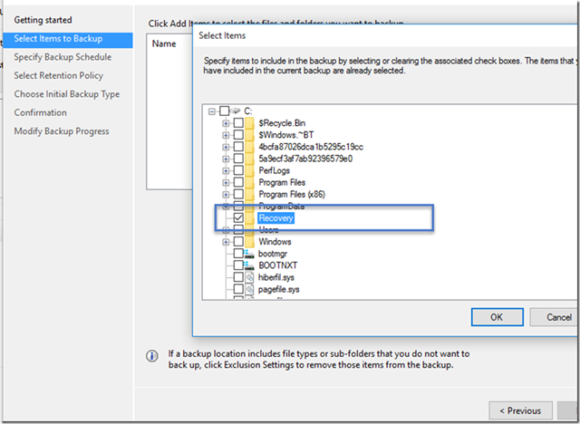 Seleccionamos los elementos de los que deseamos hacer copia de seguridad. Azure Backup de Windows Server / Windows cliente (es decir, sin System Center Data Protection Manager) nos permite proteger los archivos y carpetas. Seleccionamos una carpeta que deseamos respaldar. En este caso tomamos el directorio C:\Recovery