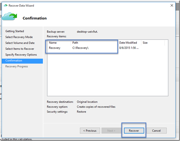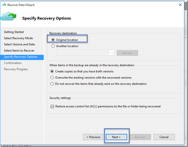 Se recomienda que deje la opción por defecto de restaurar las ACL en los archivos que están siendo recuperados. Una vez que se proporcionan estas entradas y el flujo de trabajo se inicie la recuperación que restaura los archivos de esta máquina.