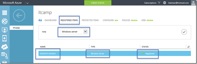 Si vas de nuevo en la copia de seguridad de Microsoft Azure servicios de recuperación se pueden ver los elementos registrados, a pesar de que es una copia de seguridad de cliente, dirá "Windows Server".