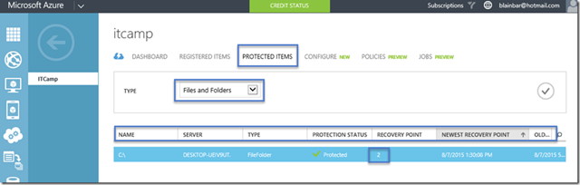 También podemos ver los elementos protegidos, pero no los archivos individuales en sí como las carpetas y los archivos se almacenan en el almacenamiento blog. Sólo se puede ver las carpetas y archivos individuales de la copia de seguridad Azure agente en la máquina física.