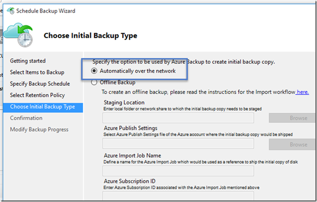 Seleccionamos el método de envío de la copia de seguridad inicial. Su opción de completar el seeding inicial depende de la cantidad de datos que deseamos hacer copia de seguridad y su velocidad de subida del enlace de Internet. Si vamos a realizar copias de seguridad de GB/TB de datos a través de una conexión con alta latencia o un ancho de banda bajo, se recomienda que complete la copia de seguridad inicial mediante el envío de un disco para el centro de datos más cercano Azure. Si tenemos una conexión de ancho de banda suficiente, la recomendacion es completar la copia de seguridad inicial través de la red.