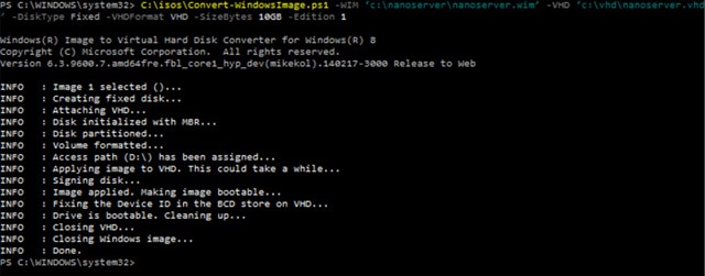 Por ejemplo: New-NanoServerImage -Edition Standard -DeploymentType Guest -MediaPath f:\ -BasePath .\Base -TargetPath .\Nano1\Nano.vhd -ComputerName Nano1