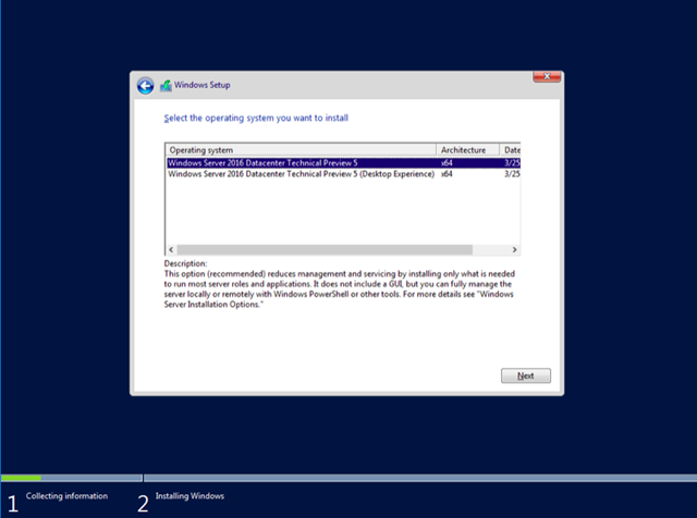 Como se mencionó anteriormente, Windows Server se puede implementar en la experiencia de escritorio de usuario (GUI) o en modo de núcleo. La recomendación es implementar sólo en el modo de interfaz gráfica de usuario (Experiencia de escritorio) cuando es absolutamente 100% requerido. El Modo de Core Server quita la interfaz gráfica de usuario y sólo proporciona una interfaz de usuario mínima, mientras que una opción adicional dentro del servidor 2016 es Nano servidor. El resto de la instalación del servidor de Windows es bastante sencillo y realmente no ha cambiado dentro de la técnica previa construye.