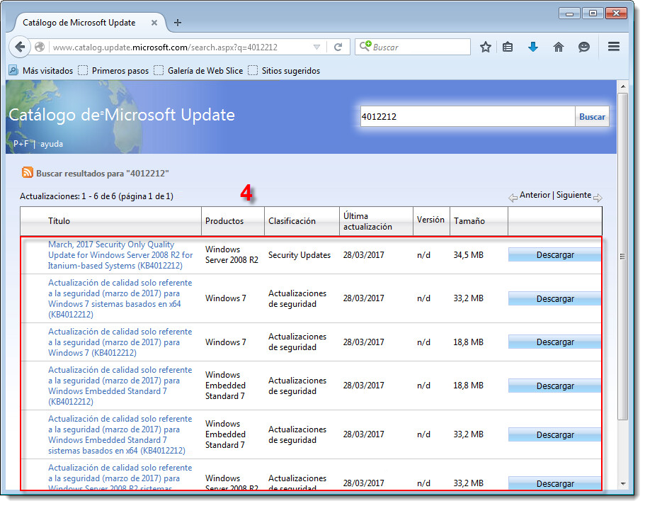 En la página Catálogo de Microsoft Update, localice su sistema operativo dentro de la columna Productos haga clic en el botón Descargar correspondiente a su sistema.