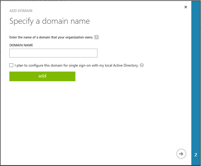 4. En la página Specify a domain name, escribimos el nombre de dominio que deseamos agregar. I plan to configure this domain for single sign-on with my local Active Directory debe estar activado para preparar la configuración como un dominio de Internet federado. Por el momento, no marquemos esta opción.