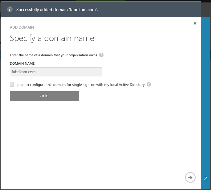 Podemos registrar varios nombres de dominio de Internet para un directorio, por ejemplo fabrikam.com, además del dominio predeterminado inicial, por ejemplo, corpfabrikam.onmicrosoft.com. Un directorio nos permite registrar un dominio de Internet sólo después de demostrar que nuestra organización es propietaria del espacio de nombres DNS en el DNS de Internet pública. A partir de esta escritura, podemos alojar hasta 600 dominios de Internet registrados en su directorio, cada uno representado por un espacio de nombres DNS diferente.