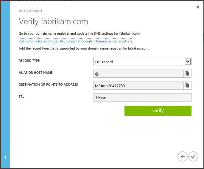 8. Una vez que se haya agregado el registro TXT a su registrador de dominio DNS, hacemos clic en Verificar para completar el registro.