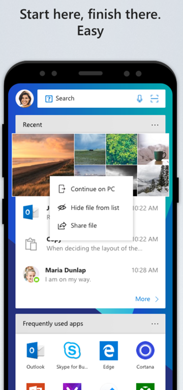 Estás haciendo cola en una cafetería y entrecierras los ojos para poder leer el texto del formulario web que estás rellenando. ¿No te gustaría que tu teléfono pudiera enviar mágicamente esa tarea a tu PC con Windows 10, donde podrías disfrutar de una pantalla grande y un teclado de hardware? ¡Ahora podés hacerlo! Microsoft Launcher vincula tu dispositivo Android y tu PC para que puedas abrir fotos o documentos al instante en una pantalla de mayor tamaño. Las aplicaciones que cuentan con la funcionalidad Continuar en PC incluyen Windows 10 Fall Creators Update.