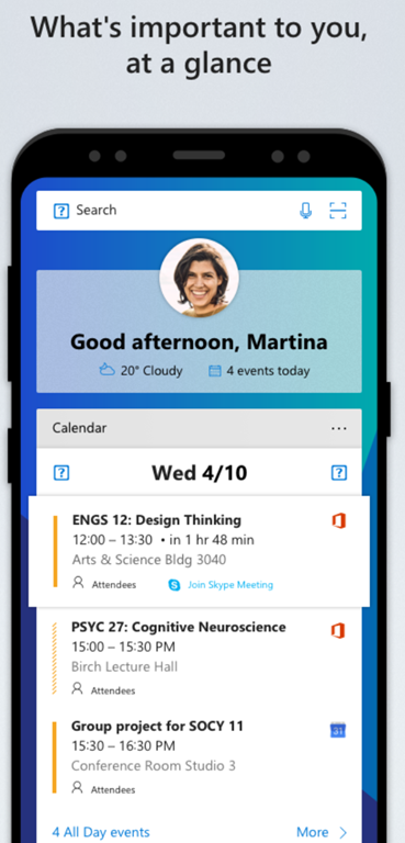 Estás mirando fijamente el teléfono mientras intentas recordar dónde guardaste una dirección, una invitación o el nombre de esa película que querías ver. En lugar de tener que buscar en todo el teléfono, Microsoft Launcher facilita la búsqueda de todo en un mismo lugar. Escribí en la barra de búsqueda en la parte superior de la pantalla Inicio para encontrar rápidamente archivos, aplicaciones y resultados web.
