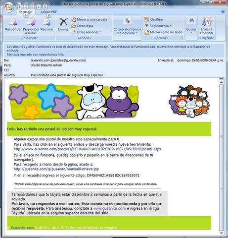 Hoy recibí un correo electrónico que era un virus, esto no es algo poco habitual ya que hay muchos dando vuelta por la red. Pero este particularmente me llamo la atención ya que tengo varios conocidos que utilizan la pagina de gusanito.com para mandar postales.