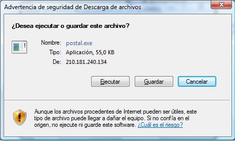 Ahora cuando haces un clic para ver la postal, va a descargar un archivo postal.exe, y veremos esta pantalla