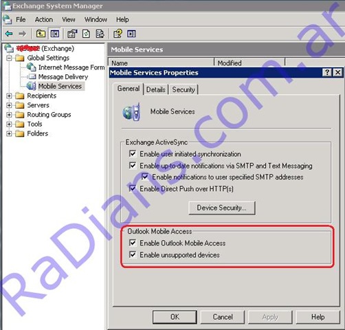 - Ahora dentro de la solapa general seleccionamos: Enale Outlook Mobile Access y Enable Unsupported Devices, y hacemos un clic en OK.