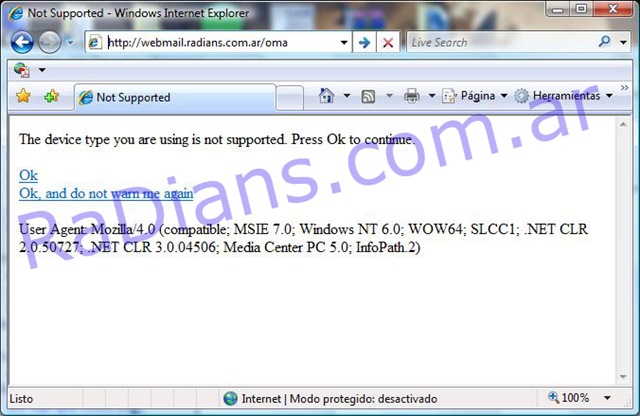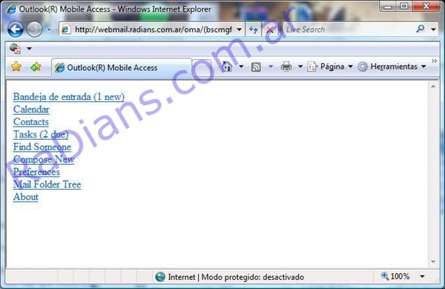 La pagina principal de OMA seria http://FQDN/OMA (debemos reemplazar FQDN con el Fully Qualified Domain Name de nuestru servidor). En nuestro caso seria http://webmail.radians.com.ar/oma