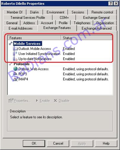 Ahora debemos configurar a los usuarios que van a poder acceder a esto, para ello abrimos la consola User and Computers, seleccionamos al usuario que queremos que utilice OMA, en la solapa Exchange Features habilitamos los servicios.