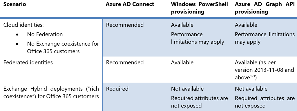 Para los clientes de Office 365, aunque también permite la creación de buzones de Exchange a través de la asignación de licencias, no permite la creación de grupos o contactos habilitados para correo. La gestión de objetos de Exchange no está cubierta. Los objetos habilitados el correo deben crearse a través de PowerShell remoto de Exchange Online, después de que los objetos se hayan replicado desde el directorio AD de Azure al directorio de Exchange Online.