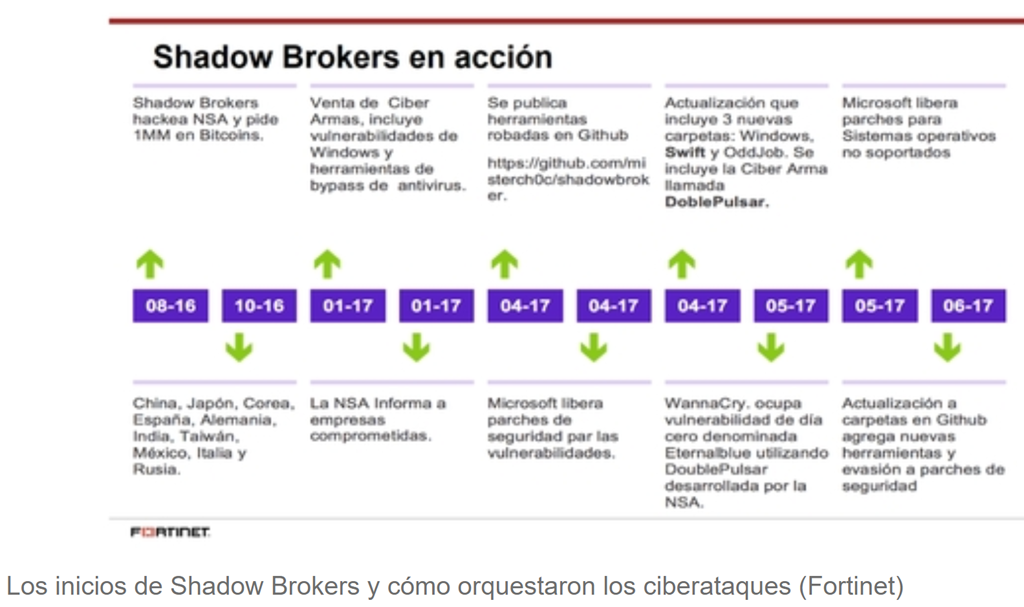 Los Shadow Brokers son conocidos por haber divulgado el exploit Eternal Blue que fue lo que derivó en el masivo ataque de WannaCry que en 2017 afectó a más de 230 mil computadoras en 150 países.