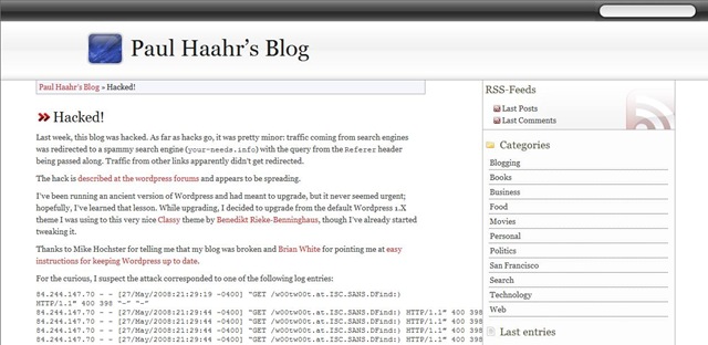 - http://baseblogging.net/2008/06/07/wordpress-hacked/