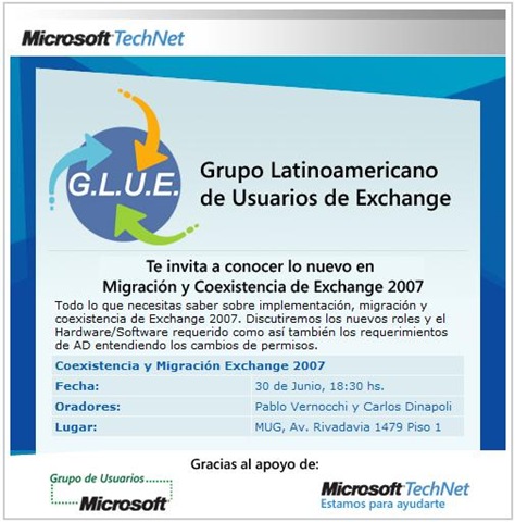 Quería invitarlos a este evento que organiza el GLUE, a quienes quieran participar pueden Inscribirse. La charla esta a cargo de Charly Di Napoli MVP de Exchange y gran conocedor de la plataforma.