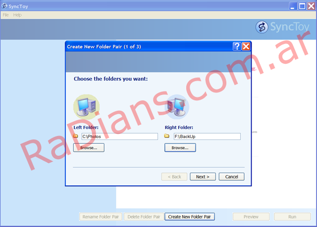 Simplemente instalas Synctoy y solo tenes que especificar las carpetas que queres comparar. Se mostrará múltiples opciones para la comparación con las explicaciones correspondientes. Esta carpeta comparación se guardarán para que usted no tiene que especificar original y carpeta de copia de seguridad cada vez.