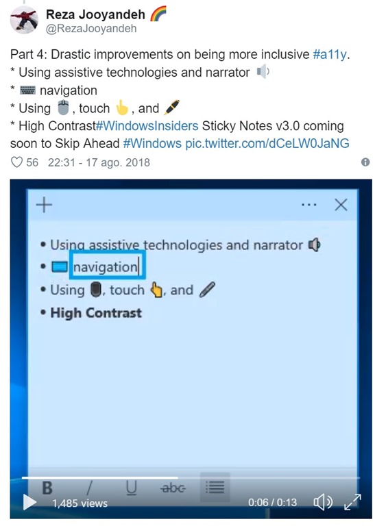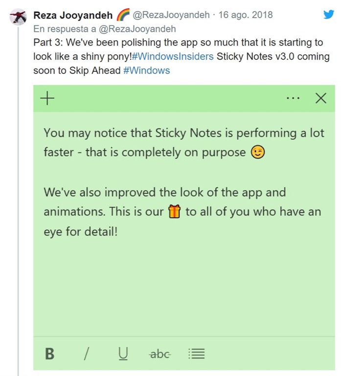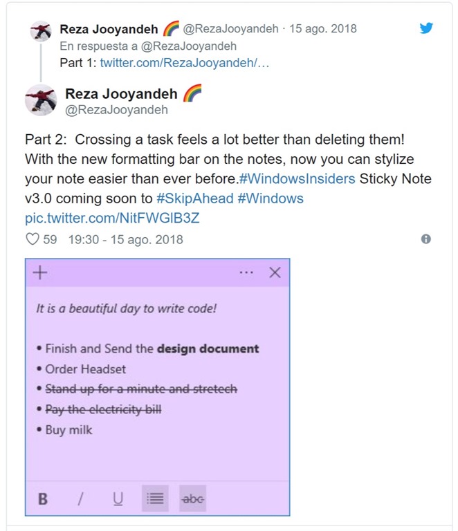 El señor Reza Jooyandeh, ingeniero de Microsoft, también ha desvelado que tendremos una suerte de texto enriquecido en las notas. Los clásicos botones de negrita, cursiva, subrayado y tachado. En la imagen que adjunta al tweet podemos ver también el botón de listado para generar listas tabuladas.