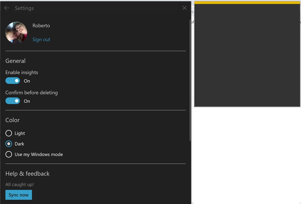 Dentro de esas novedades podemos hablar del modo Dark, que lo tenemos tambien en Office y en Windows Mail, bueno ahora lo tenemos tambien en los Sticky Notes. El clásico tema negro para no fatigar los ojos a los que se pasan más horas delante de la pantalla ha sido copiado por otros sistemas pero hasta ahora Sticky Notes se había quedado fuera.