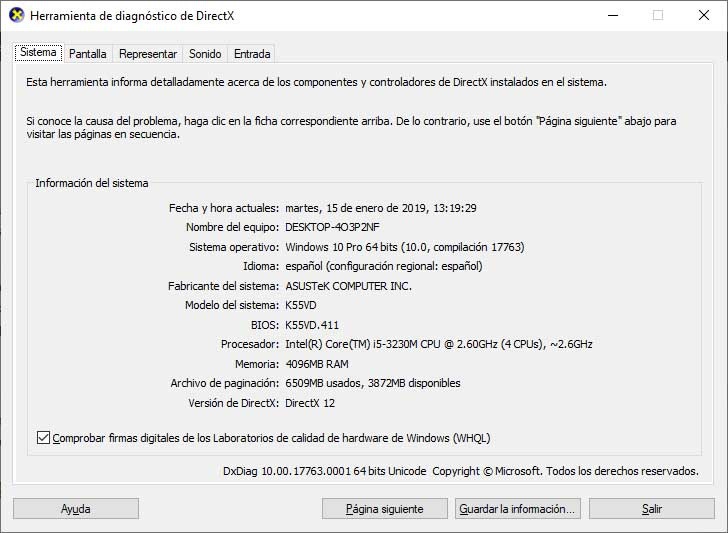 Ahí podremos ver de un solo vistazo el procesador que tenemos, la cantidad de memoria RAM y la versión de DirectX bajo la pestaña Sistema, mientras que si seleccionamos la de pantalla, podremos ver también la resolución de nuestro monitor. En la pestaña Representar, tendremos el modelo y características de nuestra gráfica si disponemos de ella.
