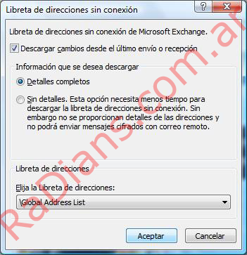 Respecto a tu pregunta, te paso este link en donde tenes una explicacion de como hacerlo y que es lo que muestra: GAL Download not working http://answers.microsoft.com/en-us/office/forum/office_2007-outlook/gal-download-not-working/77e13c19-0836-4ed4-8940-ec170ef8a491