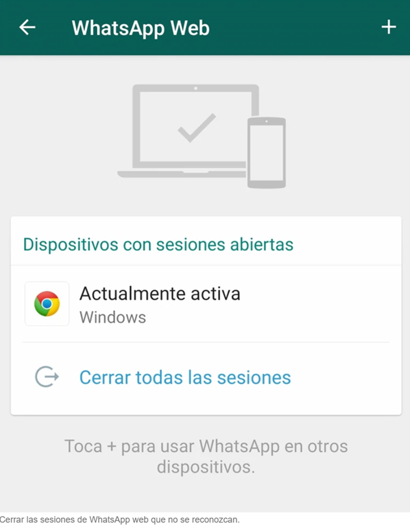 ¿Cómo te podés dar cuenta de si hay una sesión activa que vos no habilitaste? Ingresá a WhatsApp en tu celular. Hacé clic en los tres puntos que figura en el margen superior derecho, luego presioná en WhatsApp Web y fijate si hay alguna sesión habilitada. Si figura abierta una sesión que vos no abriste, entonces cerrala.