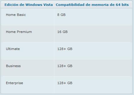 Todas las ediciones de 64 bits de Windows Vista ofrecen mayor compatibilidad de memoria, más allá del estándar de 4 gigabytes (GB) disponible en las ediciones de 32 bits. Consulta la edición específica de 64 bits de Windows Vista para determinar la capacidad máxima de memoria.