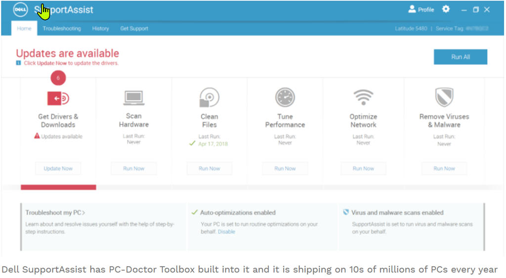 La falla radica en PC-Doctor Toolbox , software de análisis de sistemas que ha sido modificado y preinstalado en PC fabricado por algunos de los minoristas de computadoras más grandes del mundo, incluyendo Dell, su marca de juegos Alienware, Staples y Corsair. Dell solo vendió casi 60 millones de PC el año pasado y la compañía afirma que PC-Doctor Toolbox (que renombra como parte de ‘SupportAssist’) fue preinstalado en "la mayoría" de ellos.