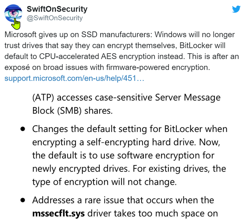 Muchos SSD de consumidores afirman que admiten el cifrado y BitLocker les creyó. Pero, como aprendimos el año pasado, esas unidades a menudo no estaban encriptando archivos de forma segura . Microsoft acaba de cambiar Windows 10 para dejar de confiar en esos SSD incompletos y usar el cifrado de software de forma predeterminada.