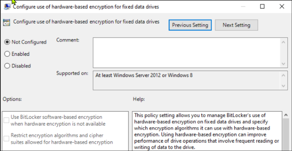 BitLocker aún puede confiar en el cifrado de hardware, si lo desea. Esa opción solo está deshabilitada por defecto. Para las empresas que tienen unidades con firmware de confianza, la opción "Configurar el uso de cifrado basado en hardware para unidades de datos fijas" en Configuración de la computadora \ Plantillas administrativas \ Componentes de Windows \ Cifrado de unidad BitLocker \ Unidades de datos fijas en la Política de grupo les permitirá reactivar el uso de cifrado basado en hardware. Todos los demás deberían dejarlo solo.