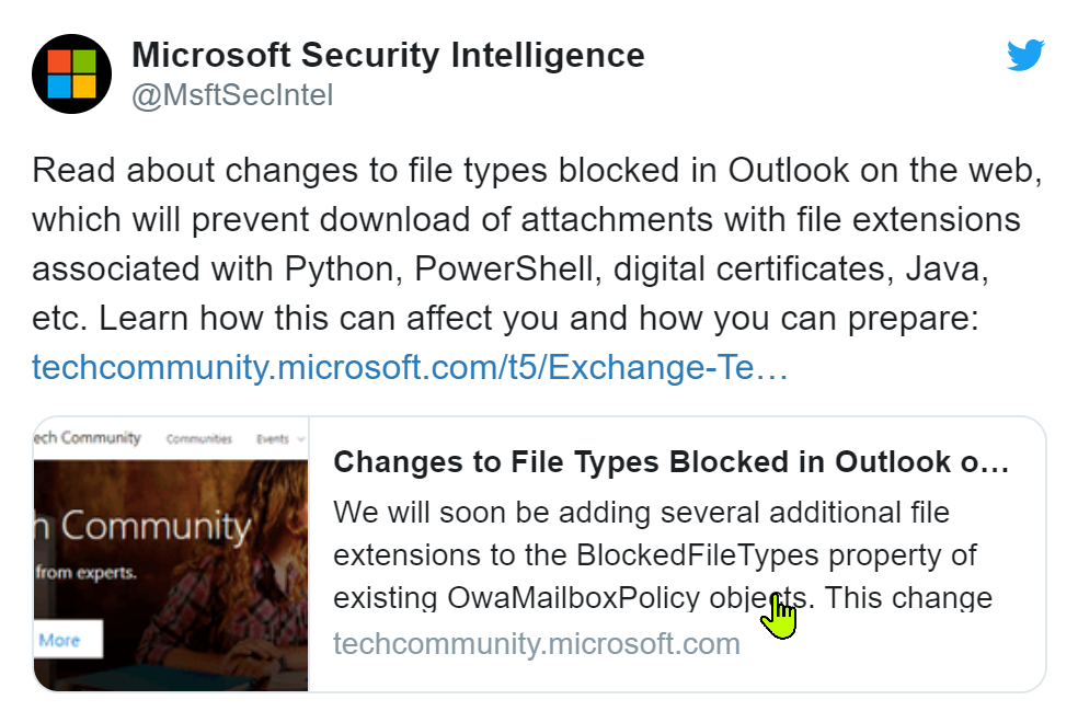 Microsoft dijo que muchos de estos tipos de archivos recientemente bloqueados rara vez se usan, por lo que la mayoría de las organizaciones no se verán afectadas por el cambio: "Sin embargo, si sus usuarios envían y reciben archivos adjuntos afectados, informarán que ya no podrán descargarlos". ellos ", dijo.