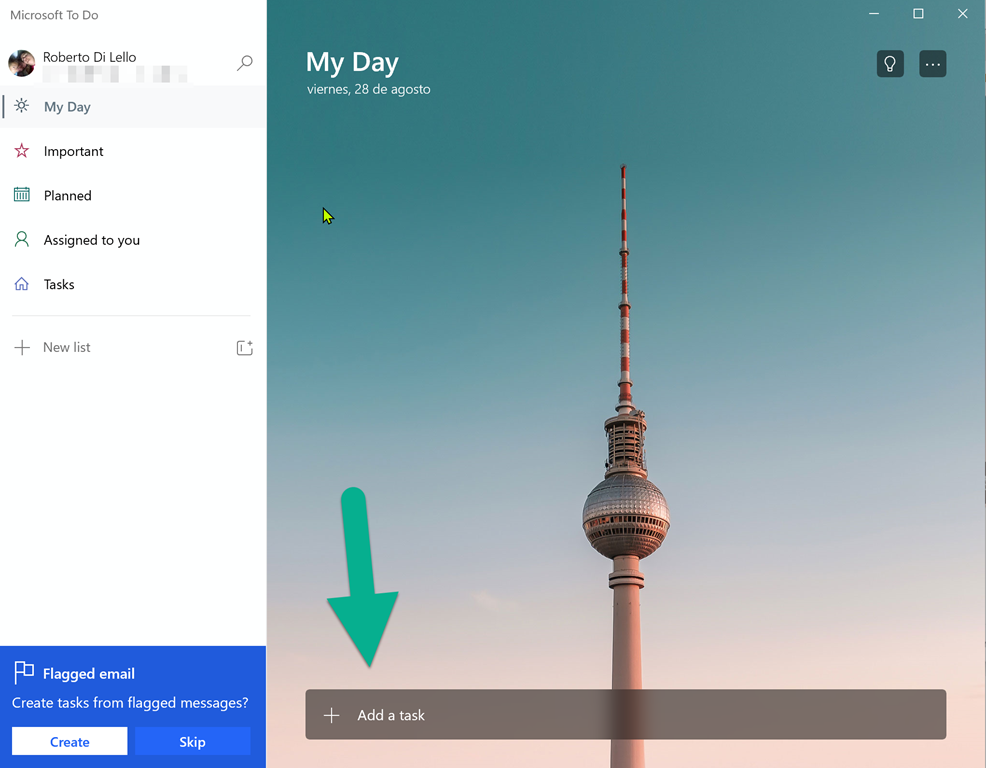 Para crear un recordatorio, primero deberás crear una tarea, que es la que se te recordará llegado el momento preciso. Para crear una nueva tarea, haz clic en Agregar una tarea y escribe el texto de la tarea. Por ejemplo: “llamar a David”.