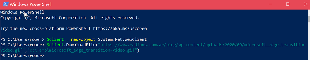 Una vez que tenemos abierta la ventana de PowerShell, solo nos queda conocer la URL del archivo que queremos bajar. Una vez la tengamos, ejecutamos el siguiente comando en la consola de PowerShell para crear una nueva instancia y preparar el programa para bajar el archivo de Internet: