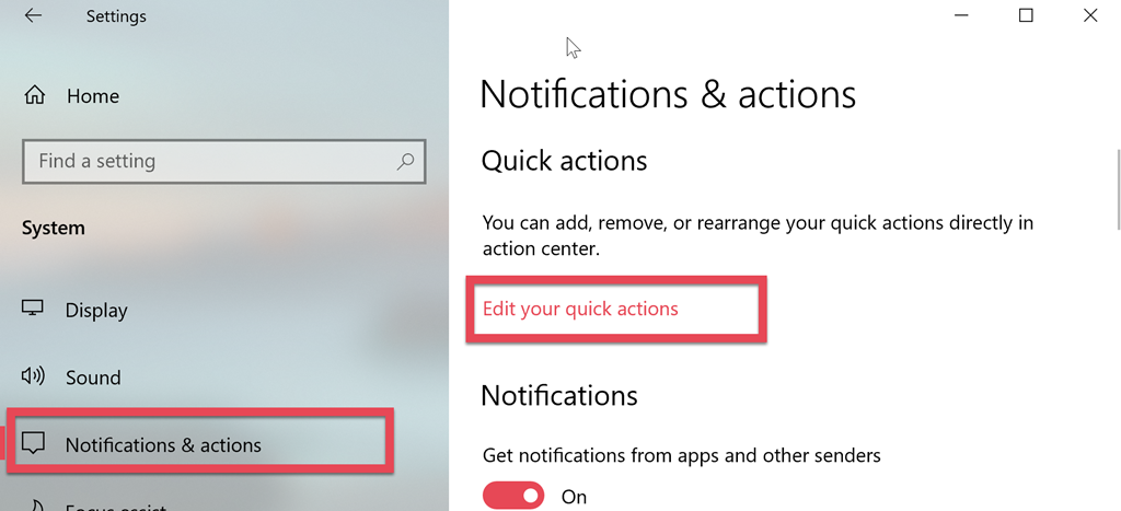 Solo debémos ir a la “Configuración”, y luego escoger el grupo “Sistema” y por último elegir de la columna izquierda la función “Notificaciones y acciones”. Se abrirá en la parte derecha un menú, donde nos tenemos como primera alternativa “Acciones rápidas”. Hacemos un clic sobre el texto azul de “Editar acciones rápidas”, y se abrirá en la parte derecha del escritorio el panel pero en modo edición.